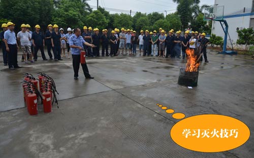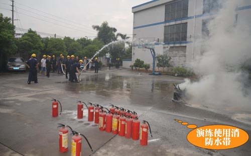 第二個環節:演練緊急疏散,模擬情景是辦公樓內響起了火災警報,樓層內的人員緊急疏散撤離,員工們現學現用,按萬隊長所教的做法撤離現場。第三個環節是演練全廠范圍內員工接到了火災警報后逃生、救助的情形,這也就是救援組、滅火組、醫務組、后勤組、模擬傷員等角色的演繹。第四個環節就是由萬隊長教大家如何正確使用滅火器、如何快速安裝消防水帶等一系列滅火動作,湯總特別強調了正確救火的重要性。期間,進行了實戰滅火操作,不少員工親自動手體驗了用滅火器撲火的過程。